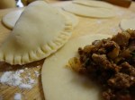 After the dough has rested, roll it out to approx 1/8″ thick and use a large biscuit cutter to cut rounds of dough. I then roll each circle just a little thinner and larger. This is what determines the size of your empanadas. It might take some trial and error to find out what size and thickness is manageable for you. The thinner the dough, the flakier the crust. When the dough round is ready to be filled, spoon filling into the center of the circle, carefully fold into a half-round and crimp the edges with a fork. I like to ensure a good seal by using an eggwash on the edges before I fold and crimp. To do this, beat an egg with a tsp of water and, using you finger, dab a little bit of eggwash onto inner edges of dough.
