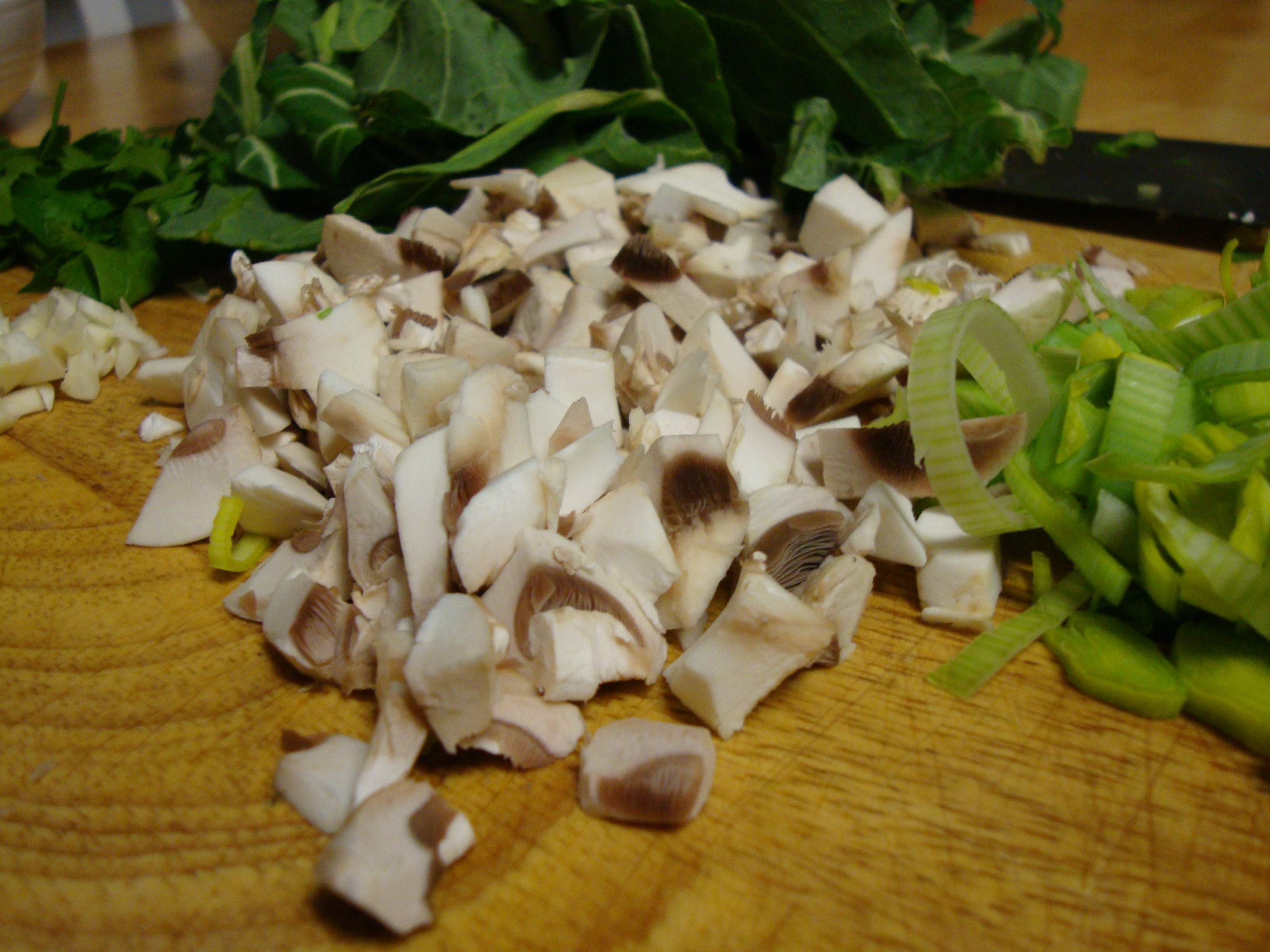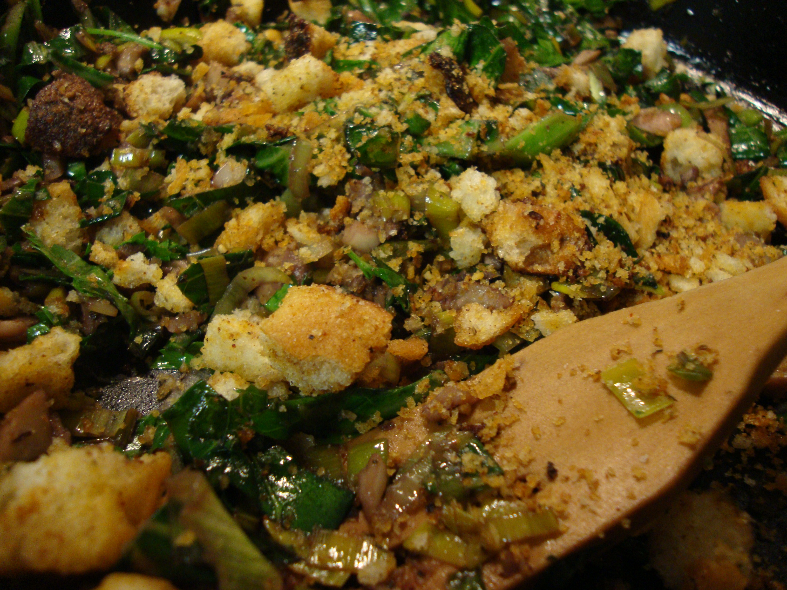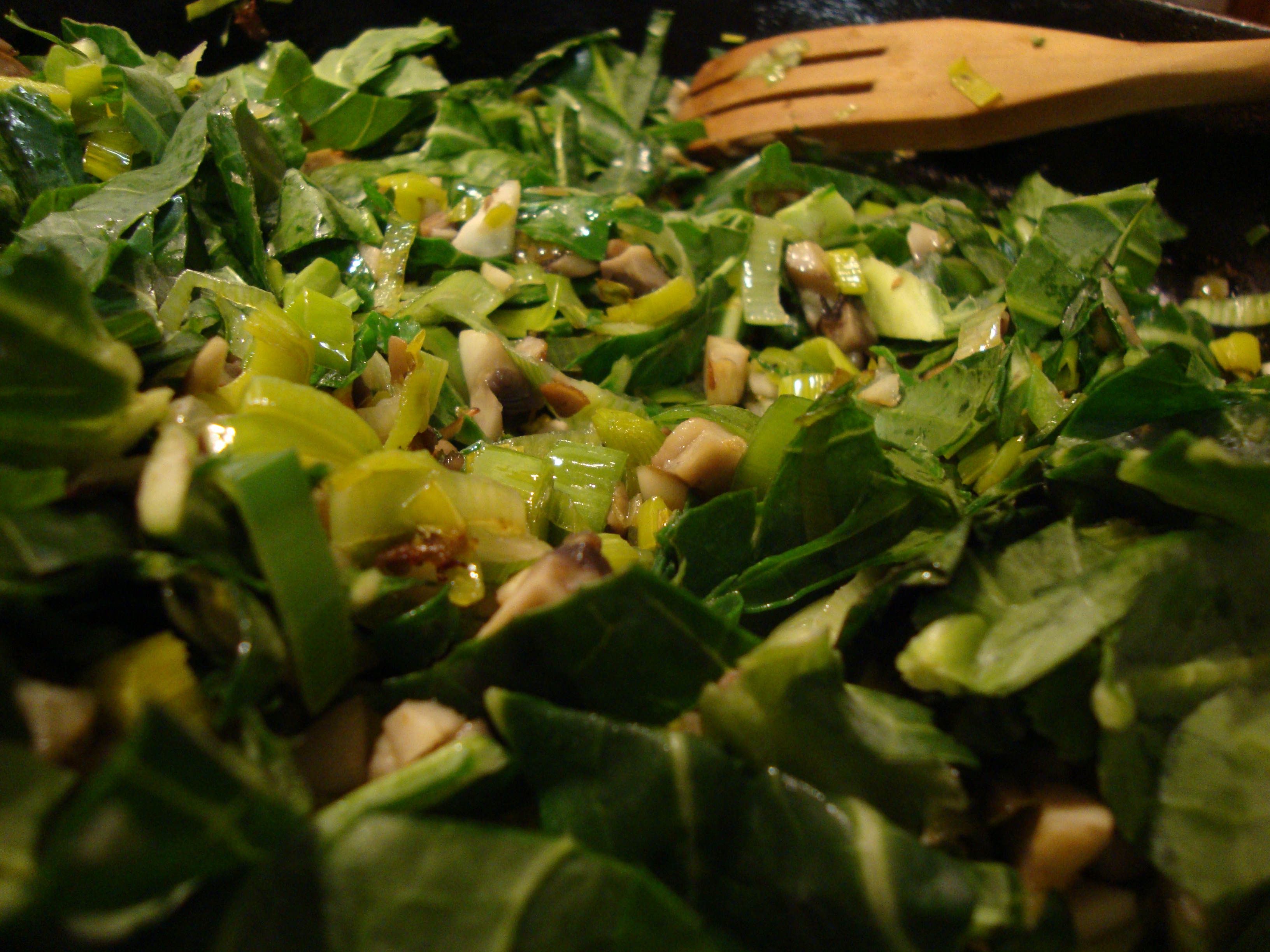 Lucking into big fat thick boneless cuts of pork, I immediately wanted to butterfly and stuff them. With what? The bag of collard greens was calling to me. I still had a leek and some mushrooms hanging out in the crisper too. Perfect. I even have leftover croutons to use as breadcrumbs.