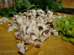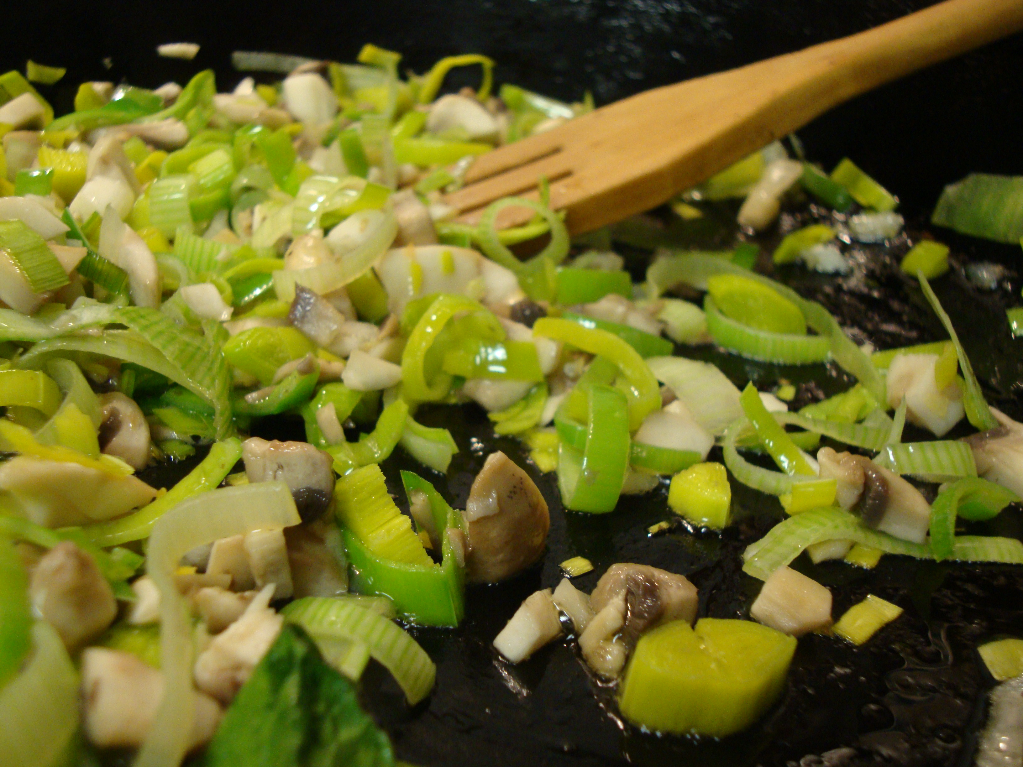 Heat 1 Tbs of oil or butter in the pan and chop & drop your veggies.