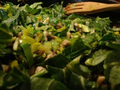 - 1/2 cup vegetable or pork broth and stir down greens till broth has cooked away and greens are soft.