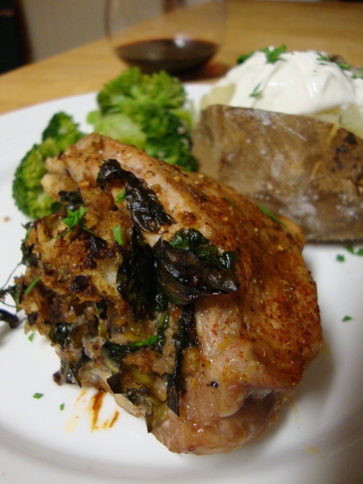 The result is my Collard Stuffed Pork Chop. Ok, so it’s not a 30 minute meal, but it is a pretty easy 60 minute satisfaction. As far as I’m concerned, pork and greens always go together.