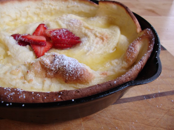 This morning I woke up very late and lazy. It was fantastic. After lollygagging around and getting hungry I wanted FOOD. I wanted breakfast, but not meaty greasy eggs and bacon and potatoes. More like pancakes with less work. A Dutch Baby is in order. A Dutch Baby is like a puffy pancake that is baked in my favorite cast iron skillet. They are supremely easy to make and wonderfully impressive when served hot from the oven.