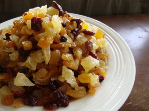 - 8 cups dried fruit, chopped. Use this combination in decreasing quantities: gold raisins, pineapple, apricots, cherries, berries, ginger and orange or citrus peel. Use a minimal of dark-colored fruits like currants and dark raisins; this is a “white” fruitcake.