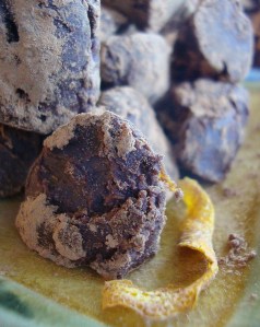 When doing some research for a goat cheese cookie, I stumbled upon a recipe for goat cheese truffles. Well it sounded good to me. With a little adaptation the results turned out so well, that I followed up the goat cheese truffle with a red wine truffle and an orange truffle.