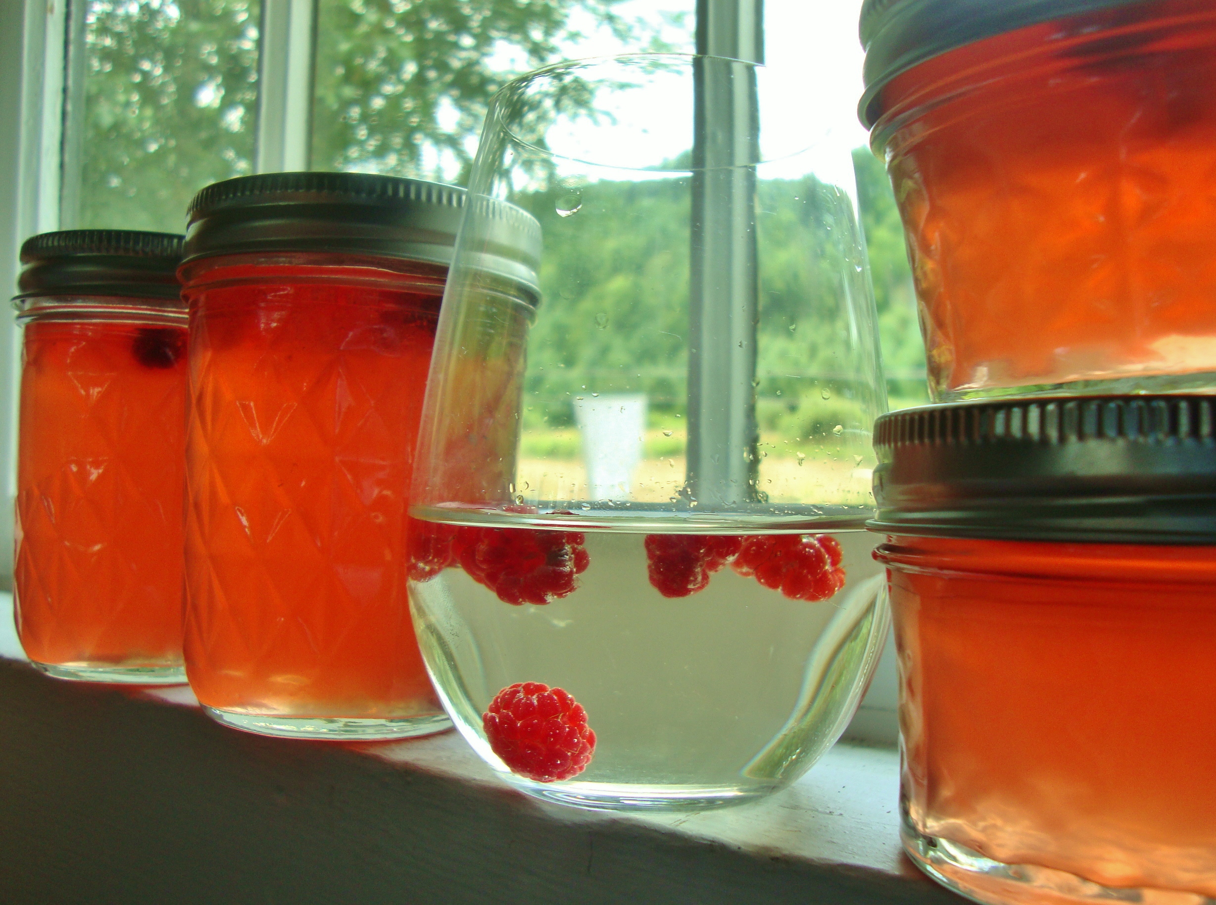Place a few raspberries in the bottom of each jar and fill the hot jars with hot jelly. Leave ¼” headspace and process in boiling water for 10 minutes.
