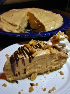 For the filling, cream together peanut butter, cream cheese, and sugar. Fold in whipped cream (cream+ sugar+ vanilla). Spoon filling into crust and refrigerate for a few hours or overnight. To serve, sprinkle with chopped peanuts and drizzle with chocolate.