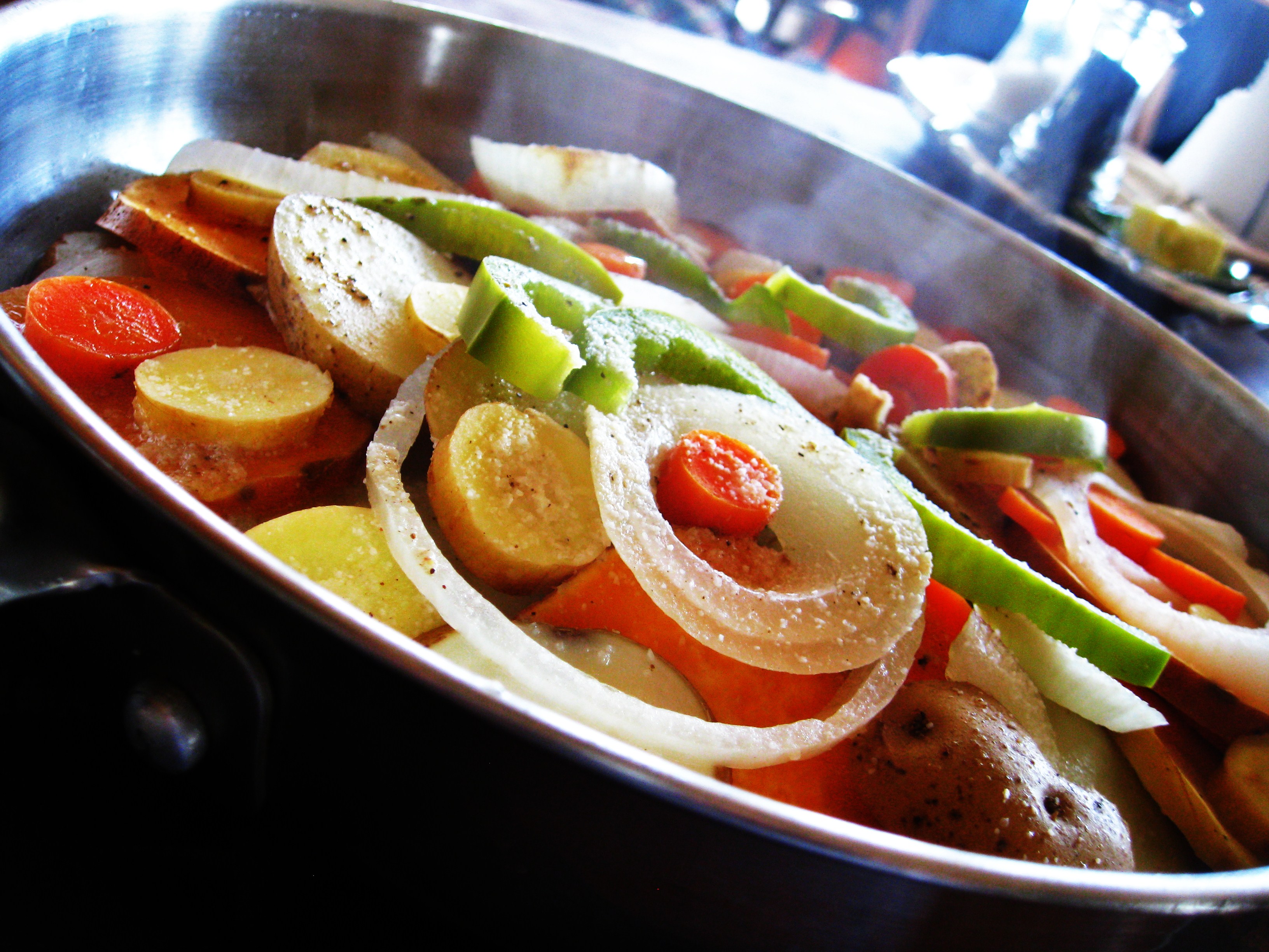 Begin by rendering the bacon in a skillet. Build one layer of root veggies on the bottom of the pan. Season with herbs, salt, pepper, and flour. Add a layer of peppers, onions, and garlic. Cover with another layer of root vegetables. Season again and top with one last layer of peppers, onions and garlic. Add chicken broth to the pan, cover and simmer for 15-20 minutes or until you can easily pierce the veggies with a knife.