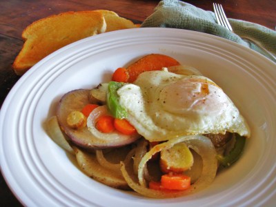 This is quick, super easy, and can be served anytime of day. Today, I chose to serve it for breakfast with an egg, a side of toast, and instead of ketchup, with paprika paste from Hungary. The other week I served it for dinner with beans and grilled chicken.