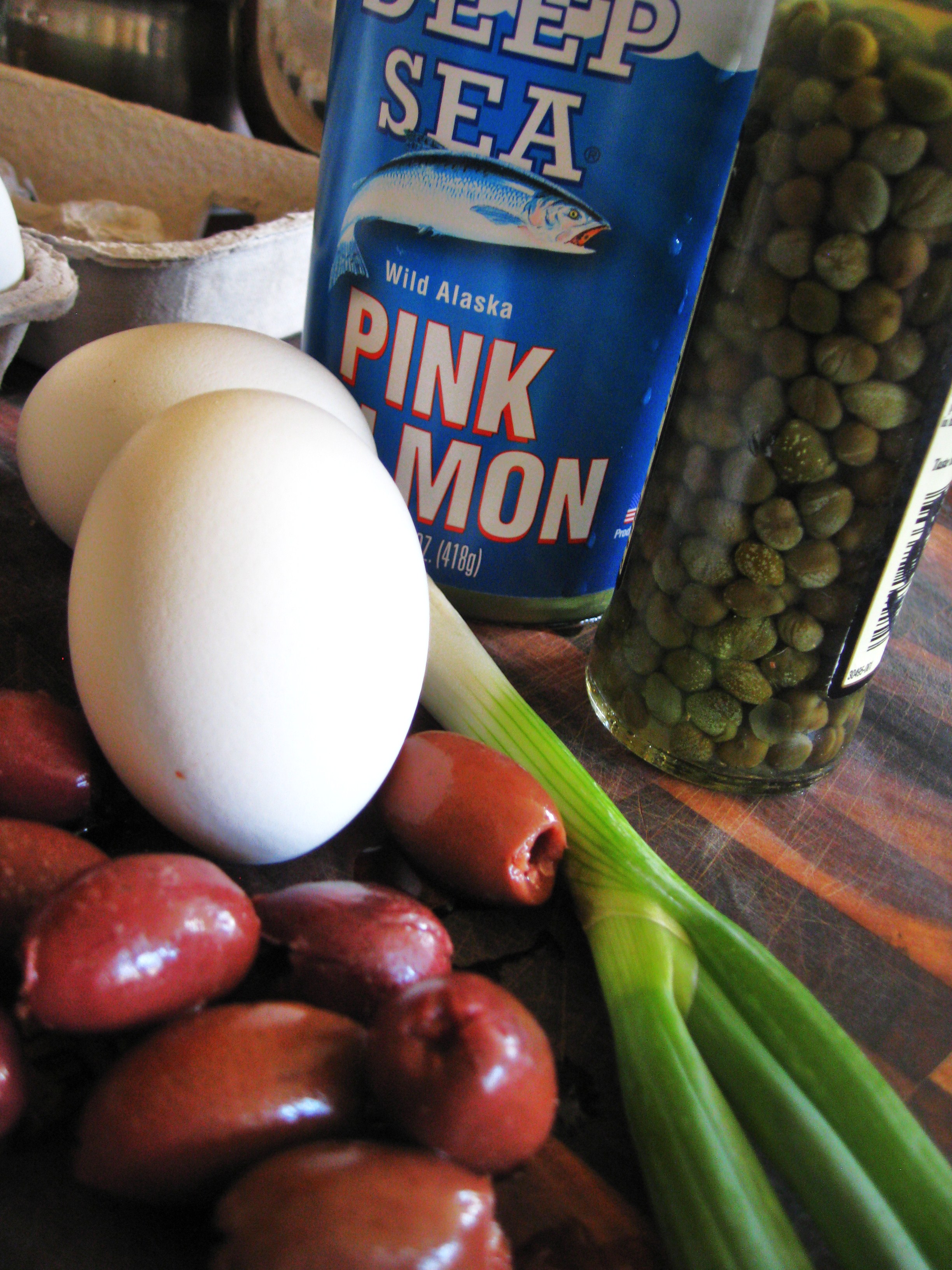 I happened to have an open can of salmon around but substitute tuna or anchovies if you like. This is also a great do-ahead platter, because things like green beans, potatoes and eggs can all be cooked ahead of time.