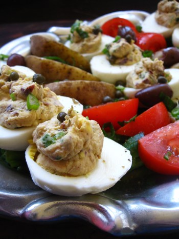 This whole plate came together while preparing deviled eggs with capers (not a bad go-to option). I spied a can of salmon on the counter that Tall Dark and Handsome was going to have for lunch. I stole into the can for a couple of tablespoons, and the result was a super tasty and slightly brined stuffed egg. Based on my crazy logic, I figured it was Niçoise salad but in egg form. Yes! Indulgent eggs and healthy options all on one plate! Now that’s a summertime platter this girl can love.
