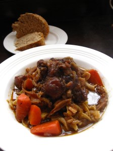 Drain any excess fat, leaving 2T in the pan. Add the thinly sliced onions to the pan and allow to cook down until translucent and soft. Add the sliced garlic and cook 3-5 more minutes. Next add the spices and tomato paste. When the mixture begins to stick, de-glaze the pan with red wine. Stir scraping up any brown bits of flavor. Next add the broth, mushrooms, carrots and bay. Add the oxtail back to the pan and bring the stew to a simmer. Partially cover the pot and transfer to the oven. Allow the stew to bake in the over (or stew on the stove) for 2-4 hours or until the meat is falling off the bone tender.
