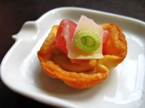 After many years of passing appetizers at events where people try exceedingly hard to be on their best behavior, I have witnessed lots of face stuffing. Sometimes this is by choice, where the guy waiting by the kitchen door will throw a few wontons in his mouth at once. Other times this is because the chef has not thought about how someone will gracefully eat a stunning 2” round crustini topped with whole shrimp, crumbled cheese, sprouts, etc…. all while holding a glass of champagne. When the first bite crumbles the only way to avoid wearing food is to shove it in your mouth!