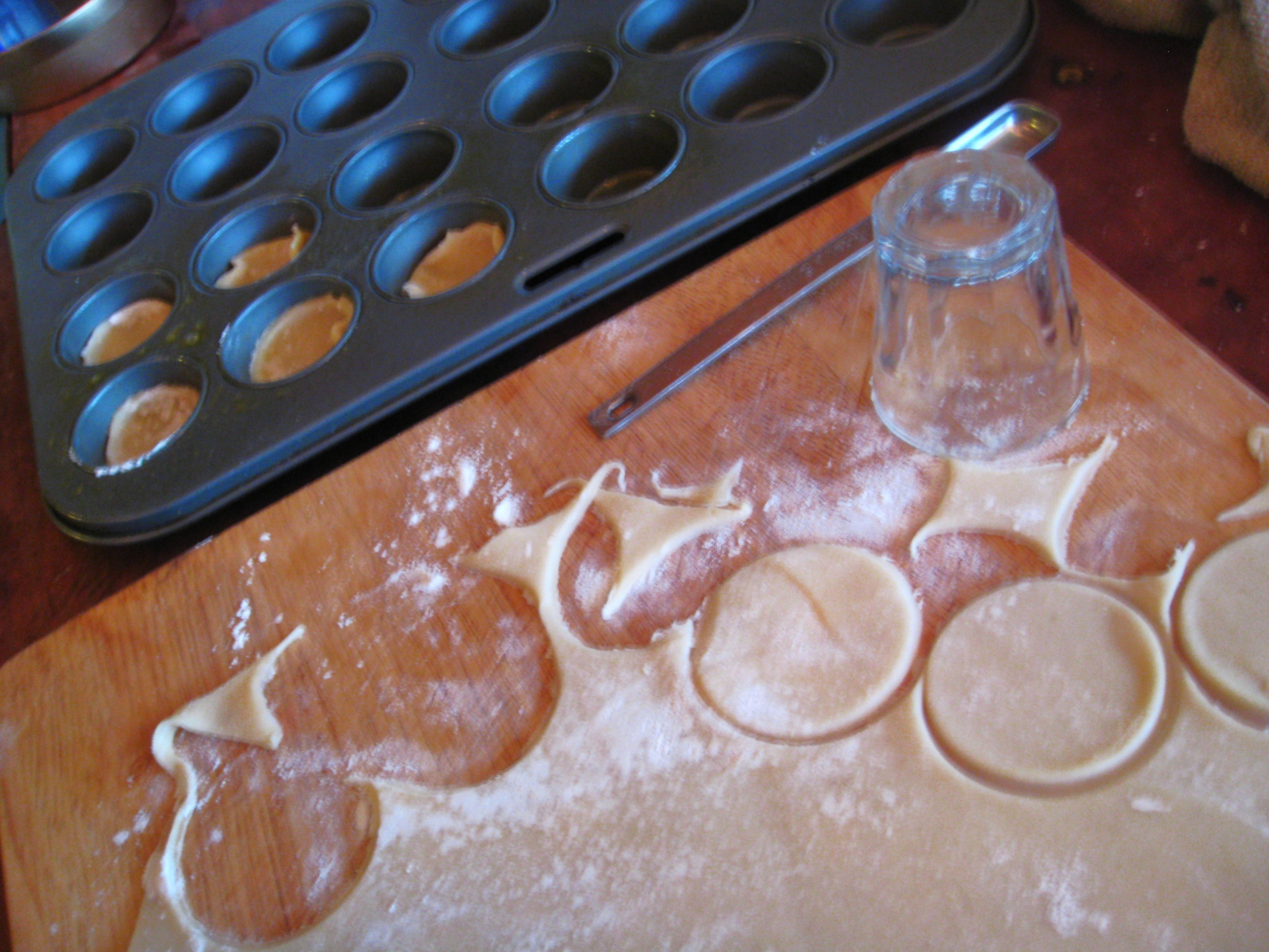 Using a shot glass (or something of similar diameter), punch little circles out of the pie dough.