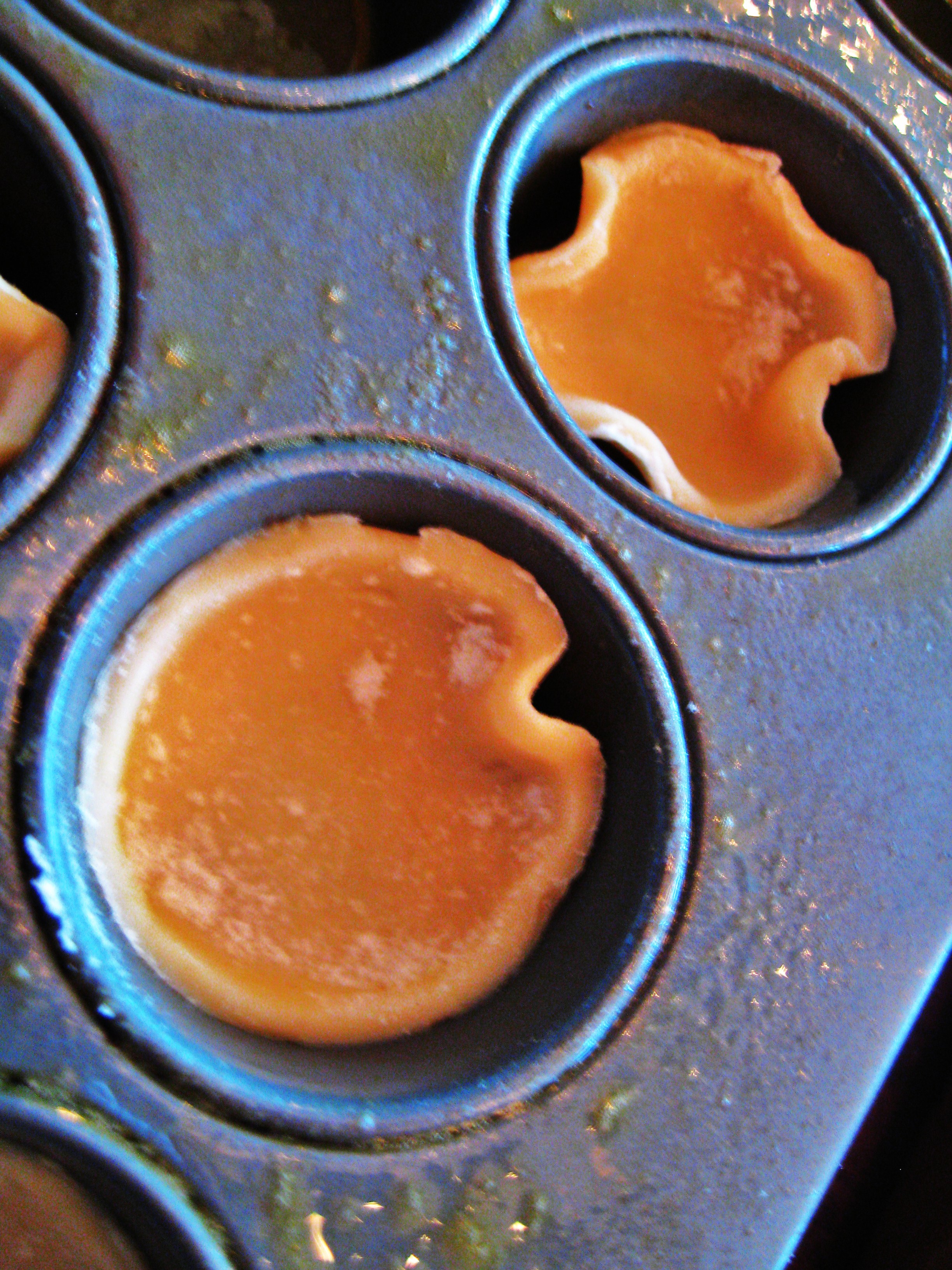 Pinch the dough circle and place into greased mini muffin tins. Using a fork, poke the center of each tart shell to keep them from “puffing.”