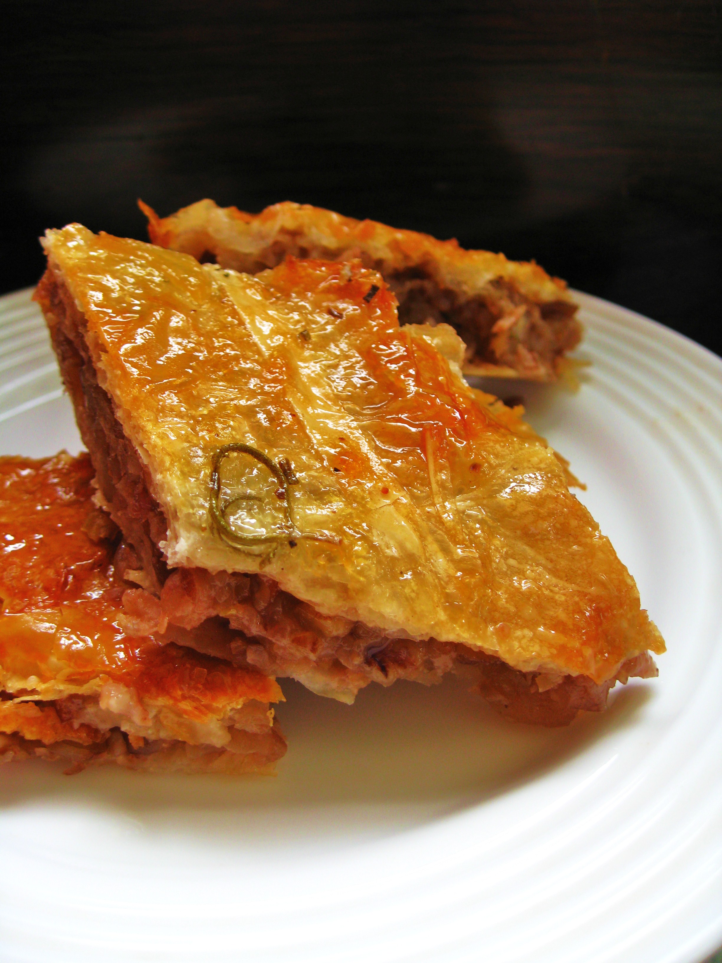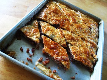 Add the apple-pecan filling and spread evenly. Dot the top of the filling with the cold butter. Press a sheet of phyllo dough on top and brush it with jelly. Add 4 more layers of phyllo and jelly. Top this layer with the reserved brown sugar- pecan mix. Spread evenly. Layer phyllo dough and jelly at least 10 more times. Top the final layer with plenty of jelly and the remaining rosemary, minced.