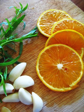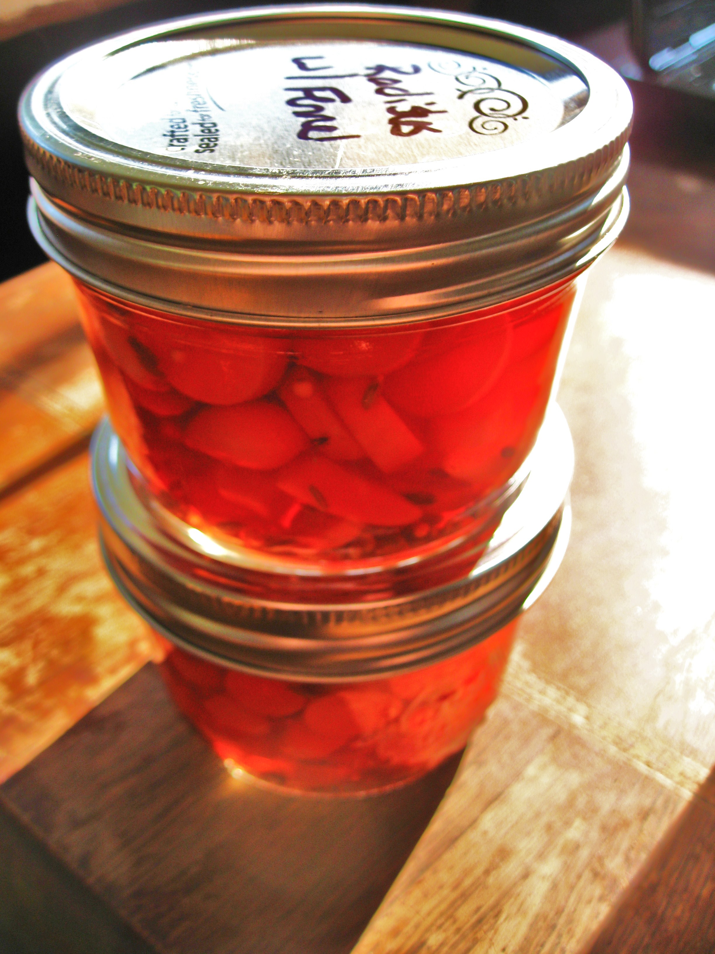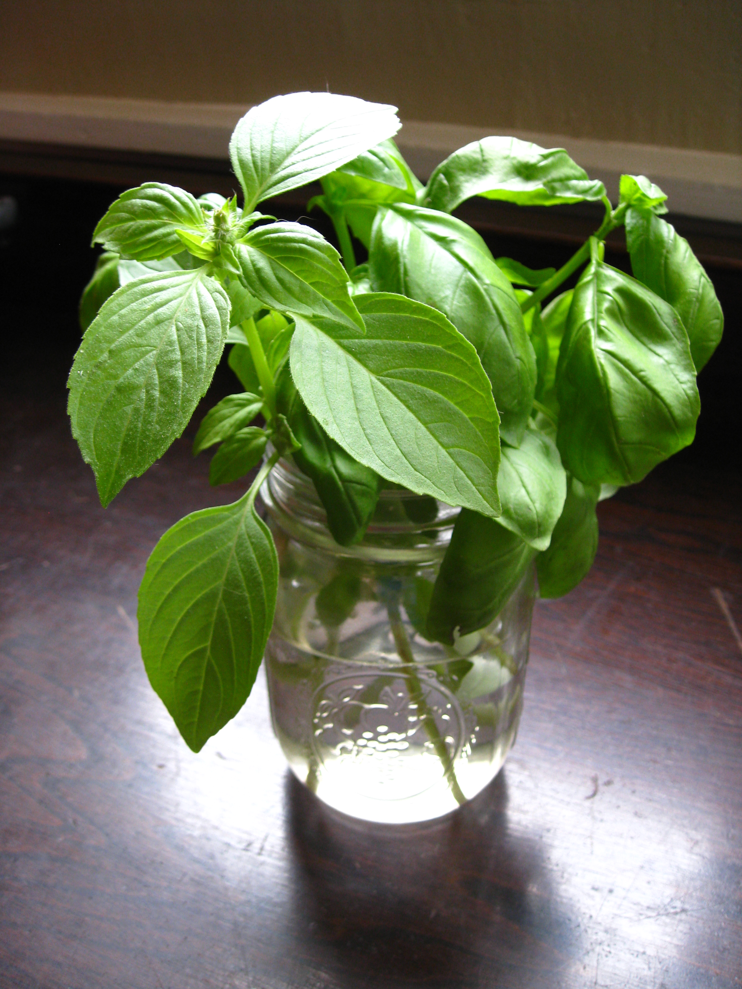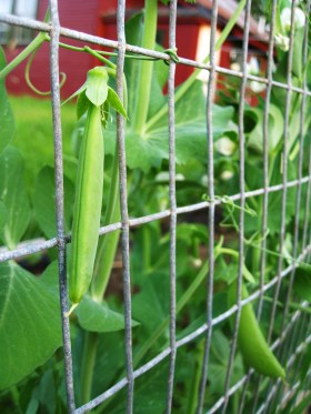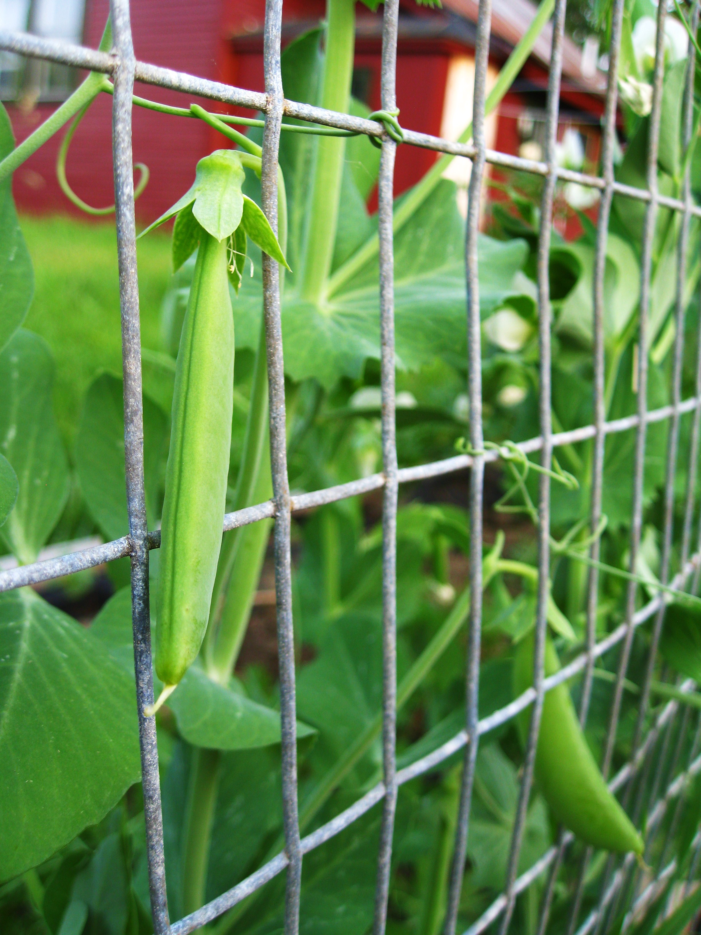 Rhubarbtarragon, orange, garlicPickled Radishes with FennelStore basil cuttings in a jar on the counter. They will begin to grow roots in days.Peas climbing the wire trellisGarlic Scape: The “flower” from hard-neck variety garlic.