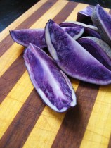 Happily browsing the shiny aisles of my local grocery store, a beautiful basket of blue potatoes stopped me in my tracks. How can I resist tight skins over firm blue flesh? I couldn’t. Those little babies belong to me.