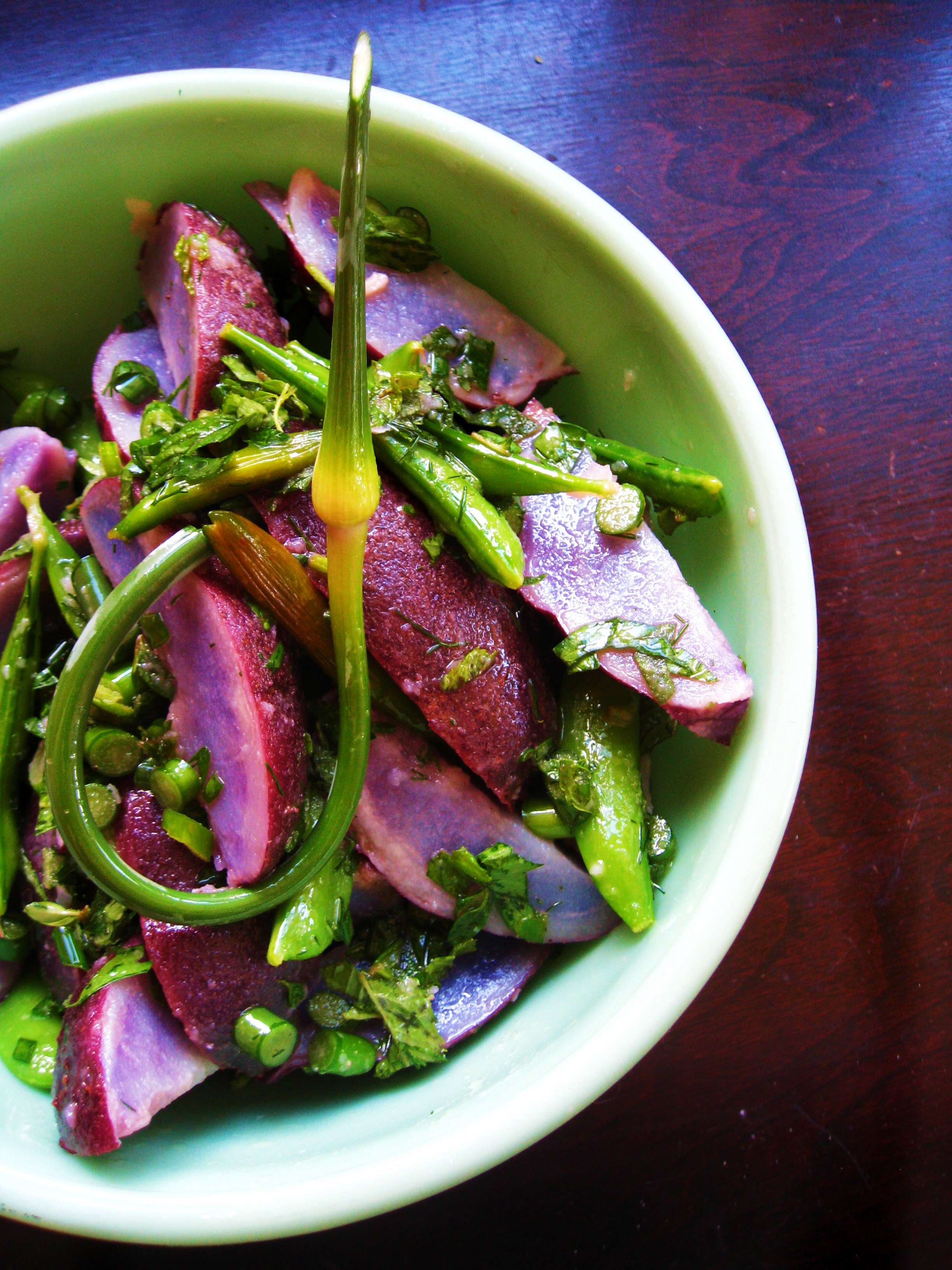 While the potatoes are still warm (after they are cooked, drained and quartered) toss them together with half of the salad dressing. Add the peas, scapes, and mint gently tossing once again. Allow to rest for 5 minutes. If the dressing has sufficiently absorbed and the potatoes are not dripping, add a bit more dressing. The aim is to coat the potatoes liberally as the dressing will be absorbed while the salad rests.