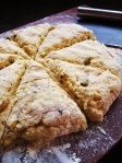 I make these in a food processor, but they can also be made by hand. To begin, simply whisk the dry ingredients together. Then rub or cut the butter into the flour mixture until the largest chunks of butter are pea sized. Make a well in the center of the flour and add the eggs and cream. Work into a sticky dough.