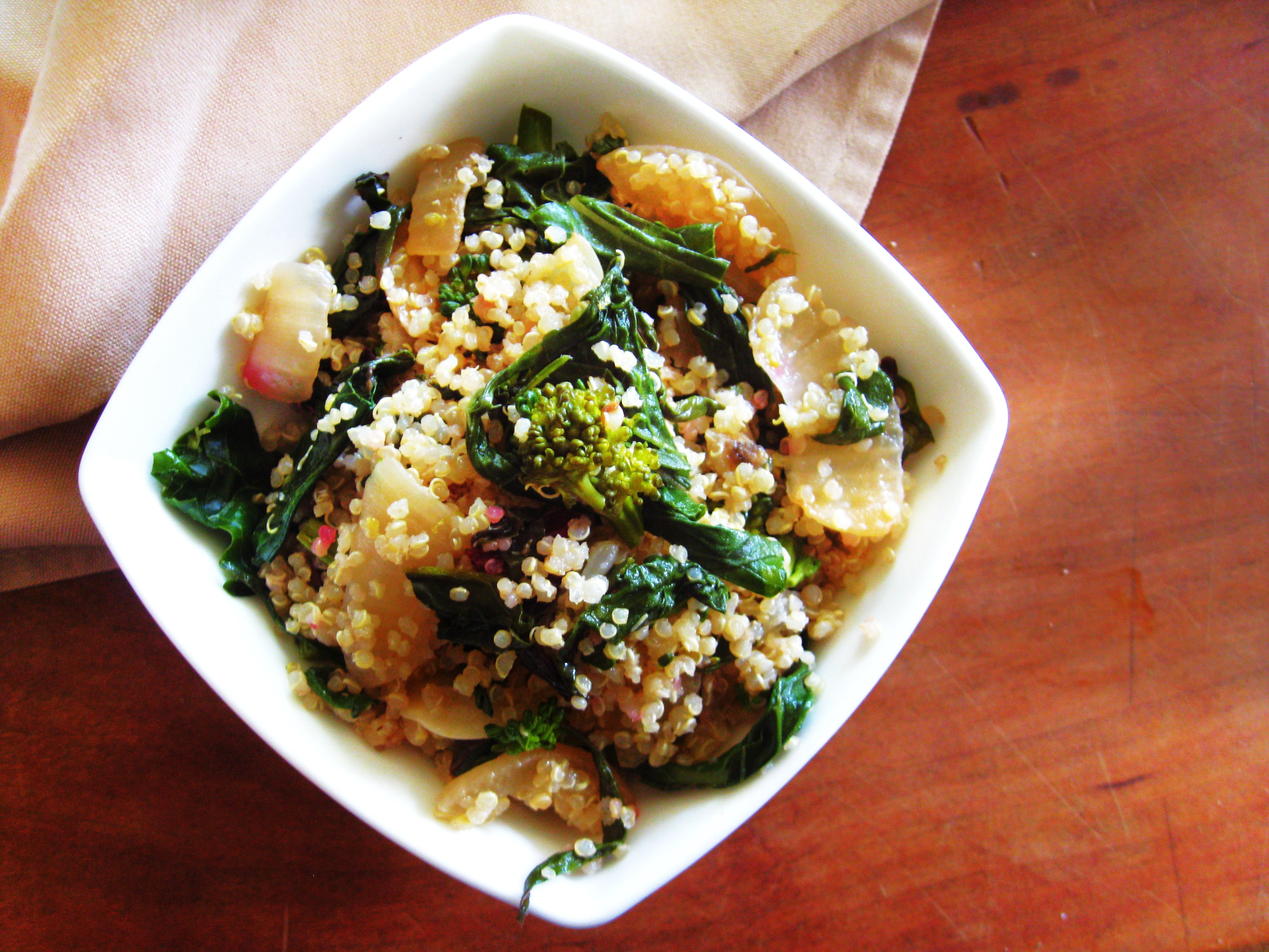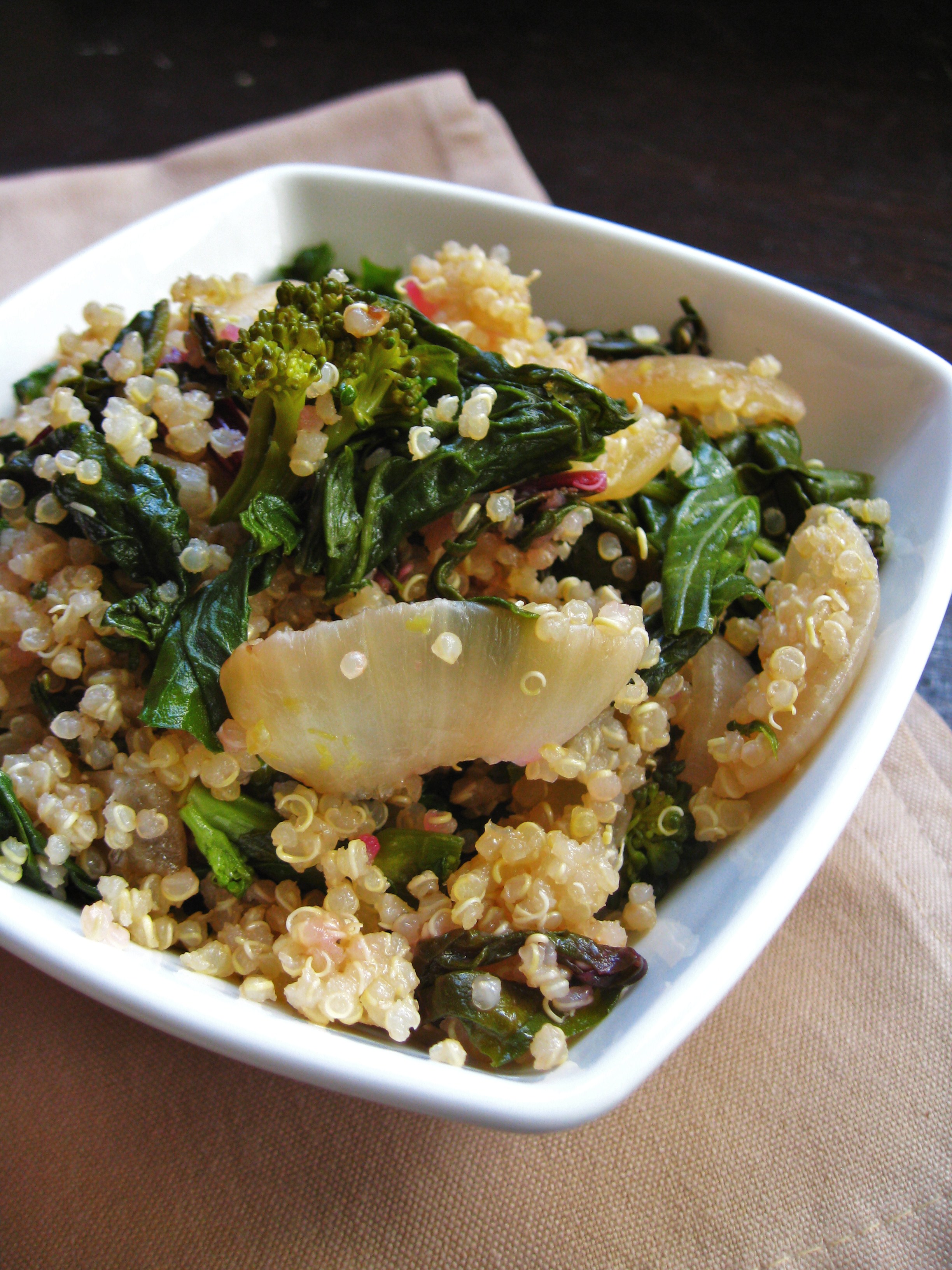 Begin by heating a wok or large skillet. Add 3T oil to the pan. When the oil is shimmering add the onion and stir fry until the edges are golden and the onion begins to become translucent. Add the garlic and red pepper to the pan. Cook for 30 seconds then add the greens. To avoid sticking, continue to move the greens in the hot pan. Sprinkle 1Tb of the vinegar and a pinch of salt over the pan cooking until the greens begin to wilt. Add the cooked quinoa, remaining balsamic and lemon zest/juice to the pan. Continue to stir fry for another minute more. Serve hot.