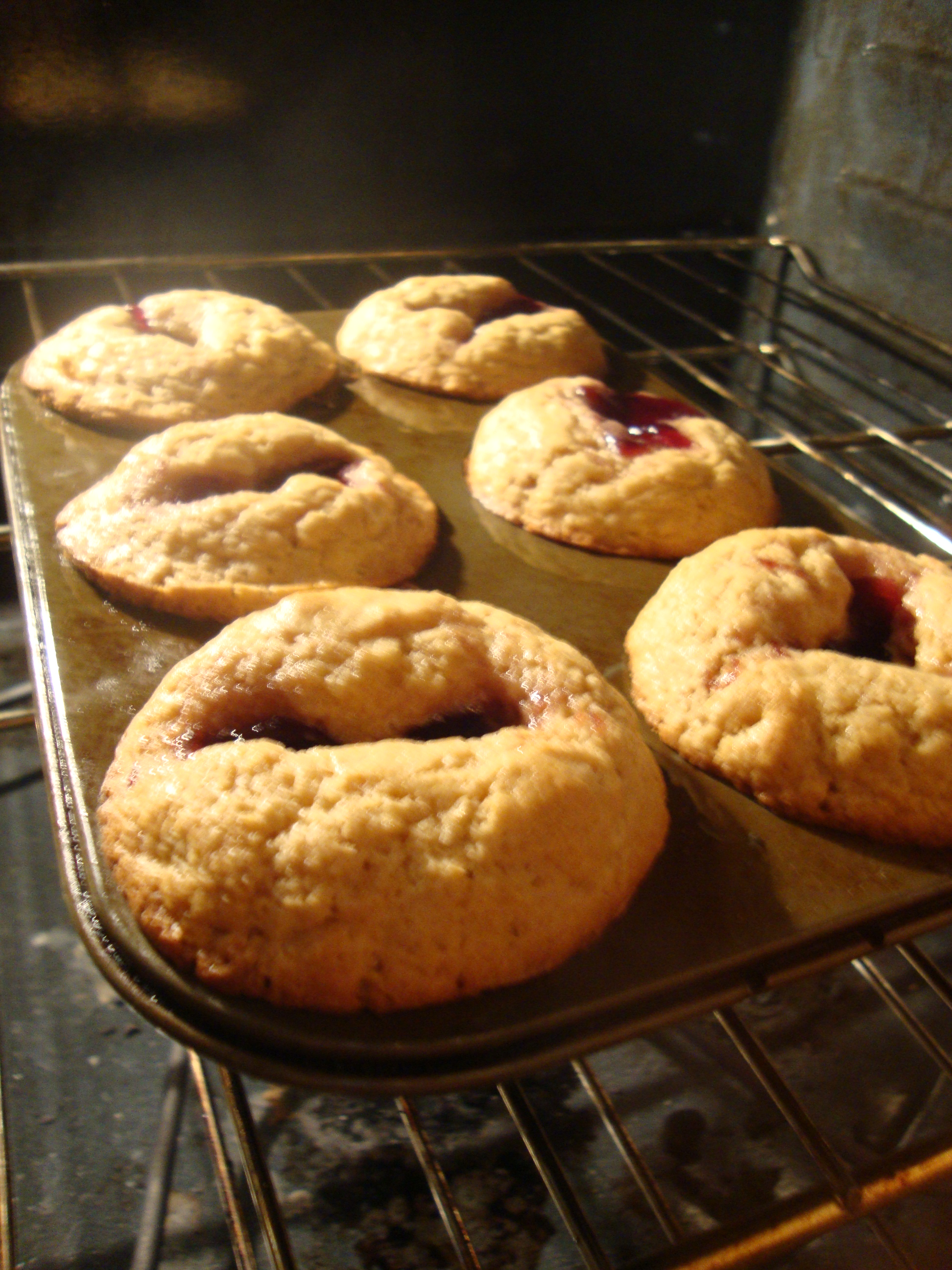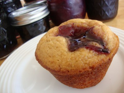 These muffins are like tender peanut butter cookies except they hold a pocket of sweet jelly. We have made these treats using many flavors of jelly and jam including maple, blackberry, and chocolate stout. I like jelly filling the best but Tall-Dark and Handsome insists that you try using strawberry preserves.