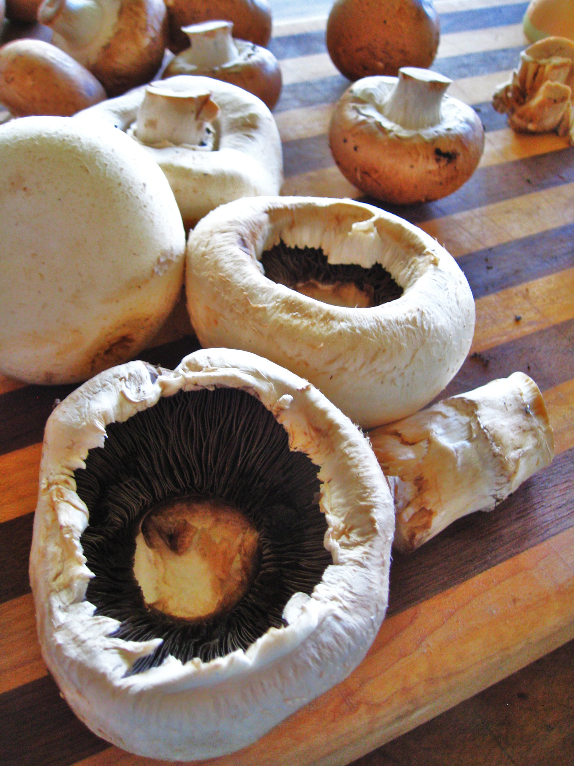 Prepare the fresh mushrooms by trimming any small stems flush with the cap and removing large stems all together. Finely dice the stems and reserve. Set aside 1lb of small mushroom caps for browning. Thinly slice the remaining mushrooms.