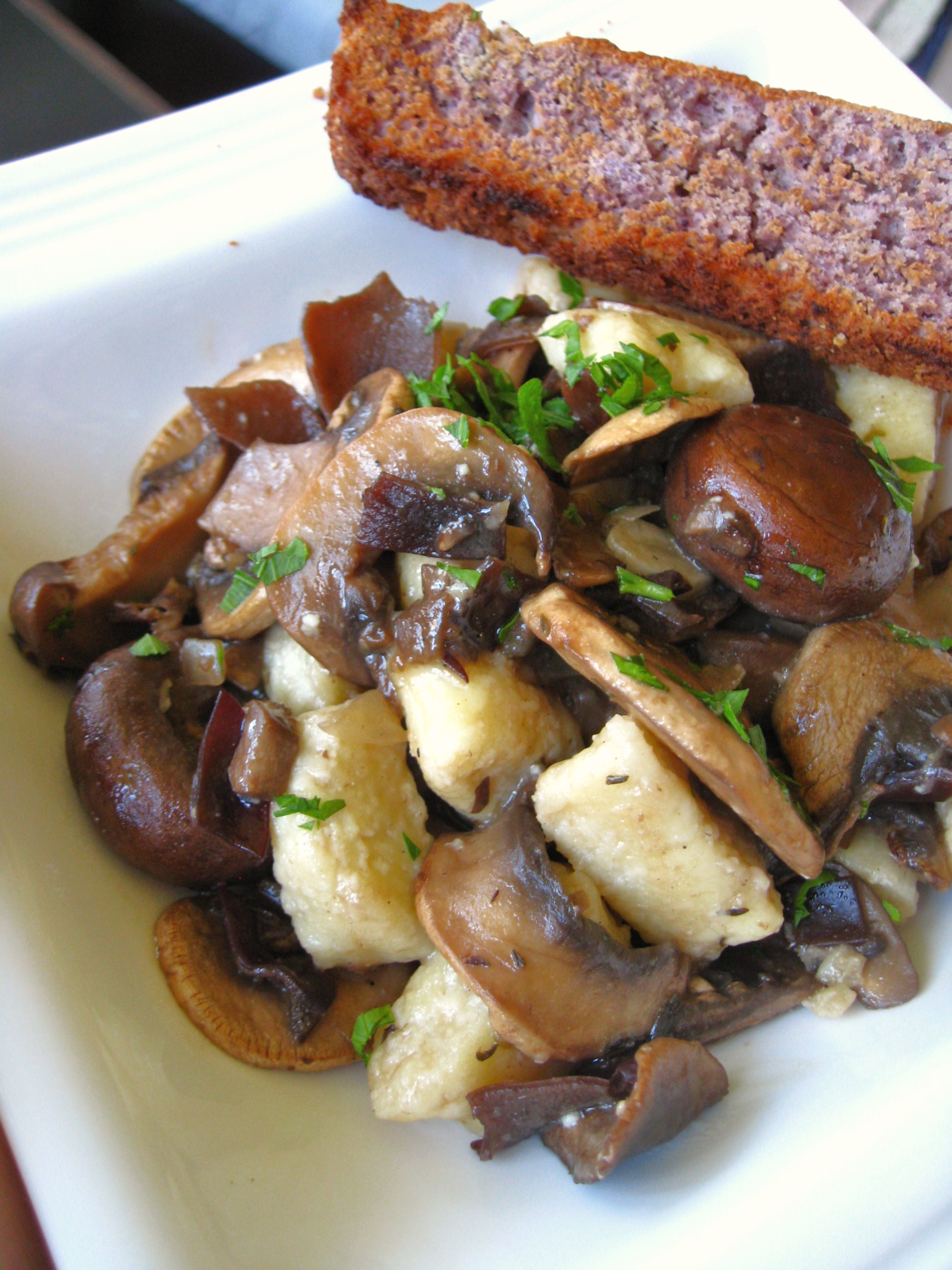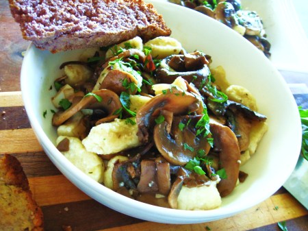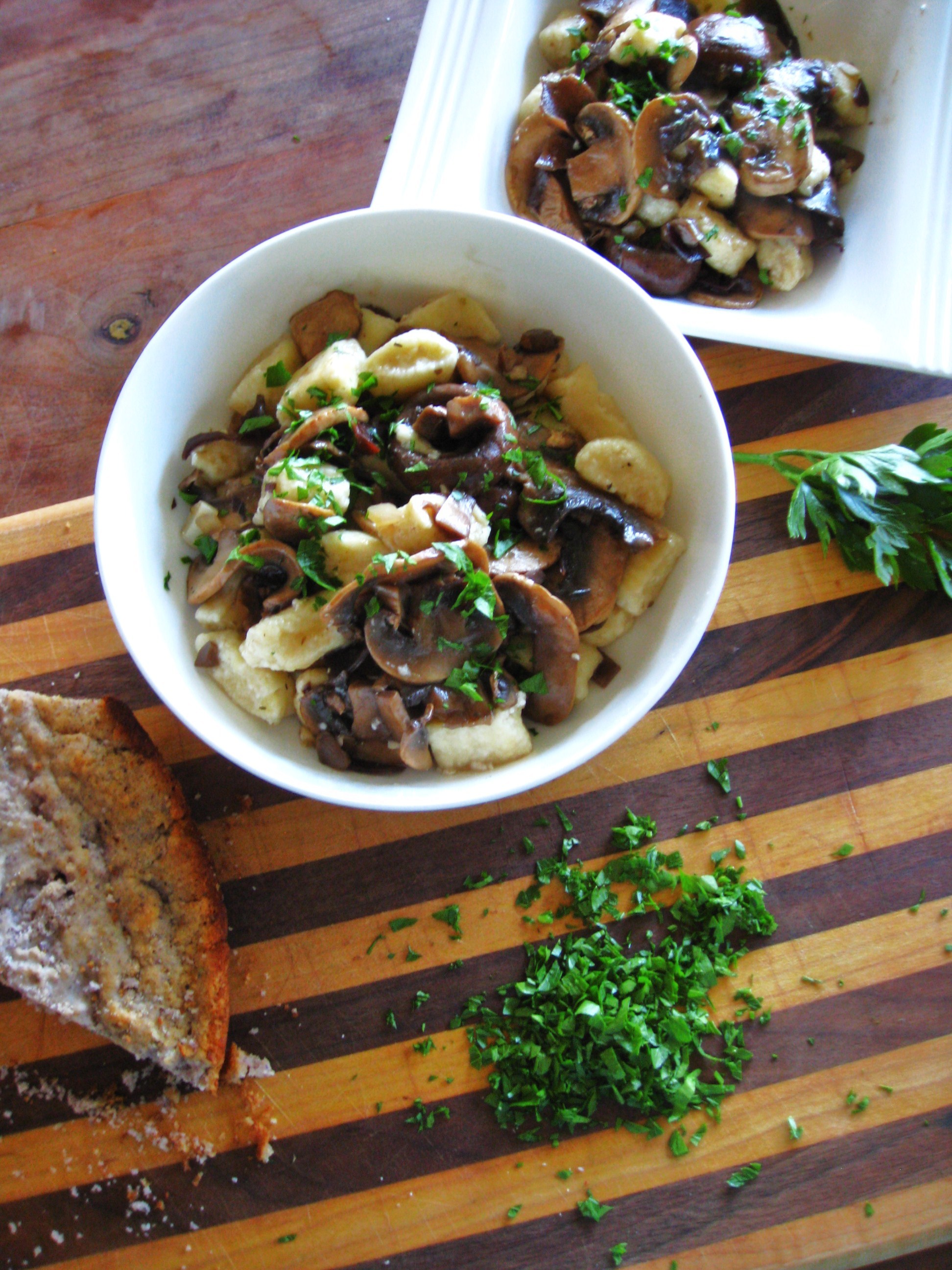 To gussie it up, Sauté the gnocchi briefly in a bit of butter until they begin to form a golden crust. Add mushrooms with sauce to the gnocchi pan and toss to coat. Garnish with chopped parsley or parmesan cheese.