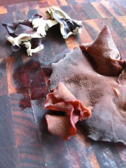 Begin by soaking dried mushrooms in 2c boiling water. Allow the mushrooms to rest and rehydrate until the water has cooled. Drain mushrooms and reserve the liquid. Slice reconstituted mushrooms and set aside in a large bowl.