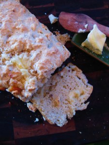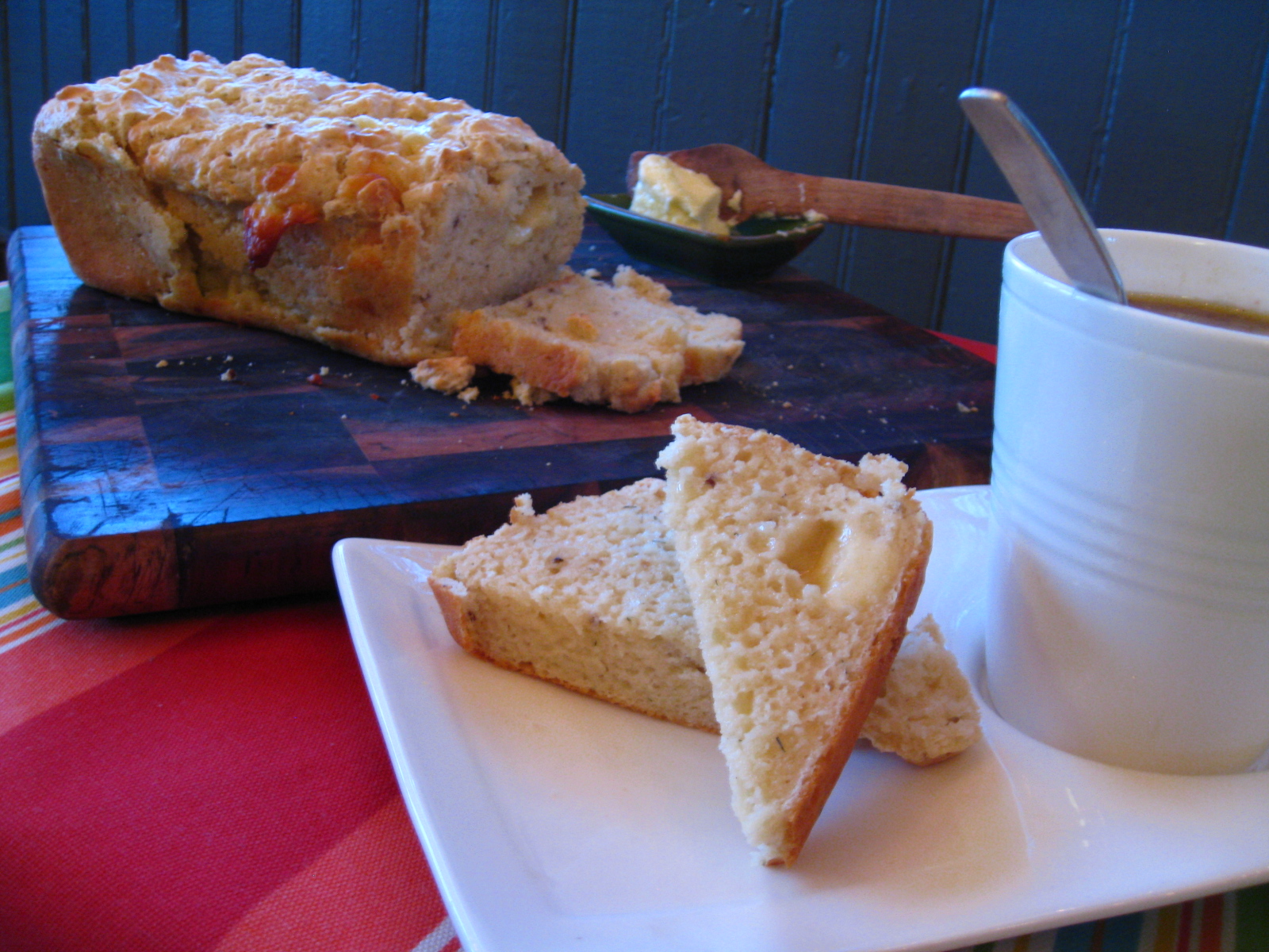 Per usual, I think that one of the best things about this recipe is that there is not much down time. Mix then bake and you’re done. No need to rise. The resulting bread has a dense crumb but it still very tender. The herbs lend a more subtle flavor and would benefit from a pinch of cayenne if that suits your style.