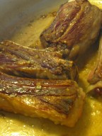 Begin by browning short ribs in a heavy pan. Browning the meat first adds extra flavor but this step can be skipped if you are short on time.