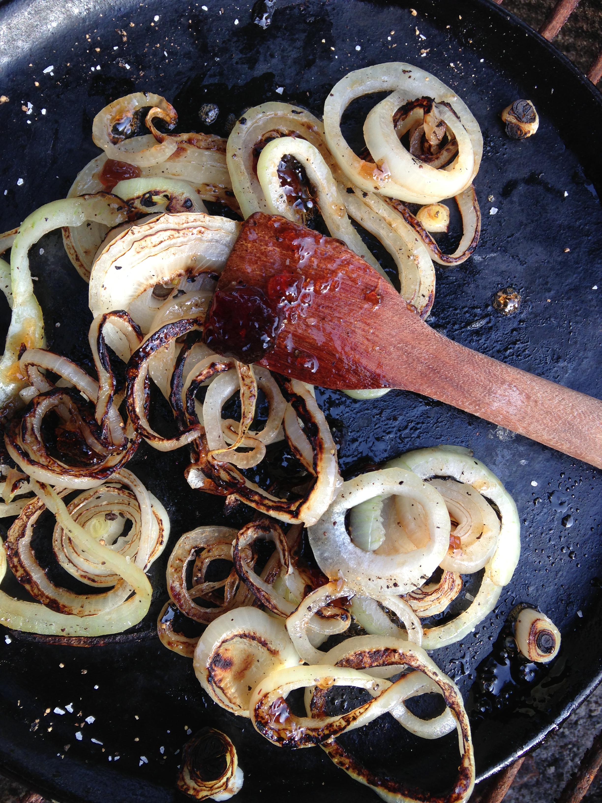 When making caramelized onions I have two secret weapons: A well-seasoned cast iron pan & a bit of beer jelly. It is important for the pan to be hot because it creates the initial char or caramelization that is the building block for flavor. The flavor of the jelly is all personal preference. I like to use a mild beer jelly like Green Mountain Ale or Apricot Ale but dark beer jelly, coffee jelly, balsamic jelly, or even pepper jelly would be awesome too.