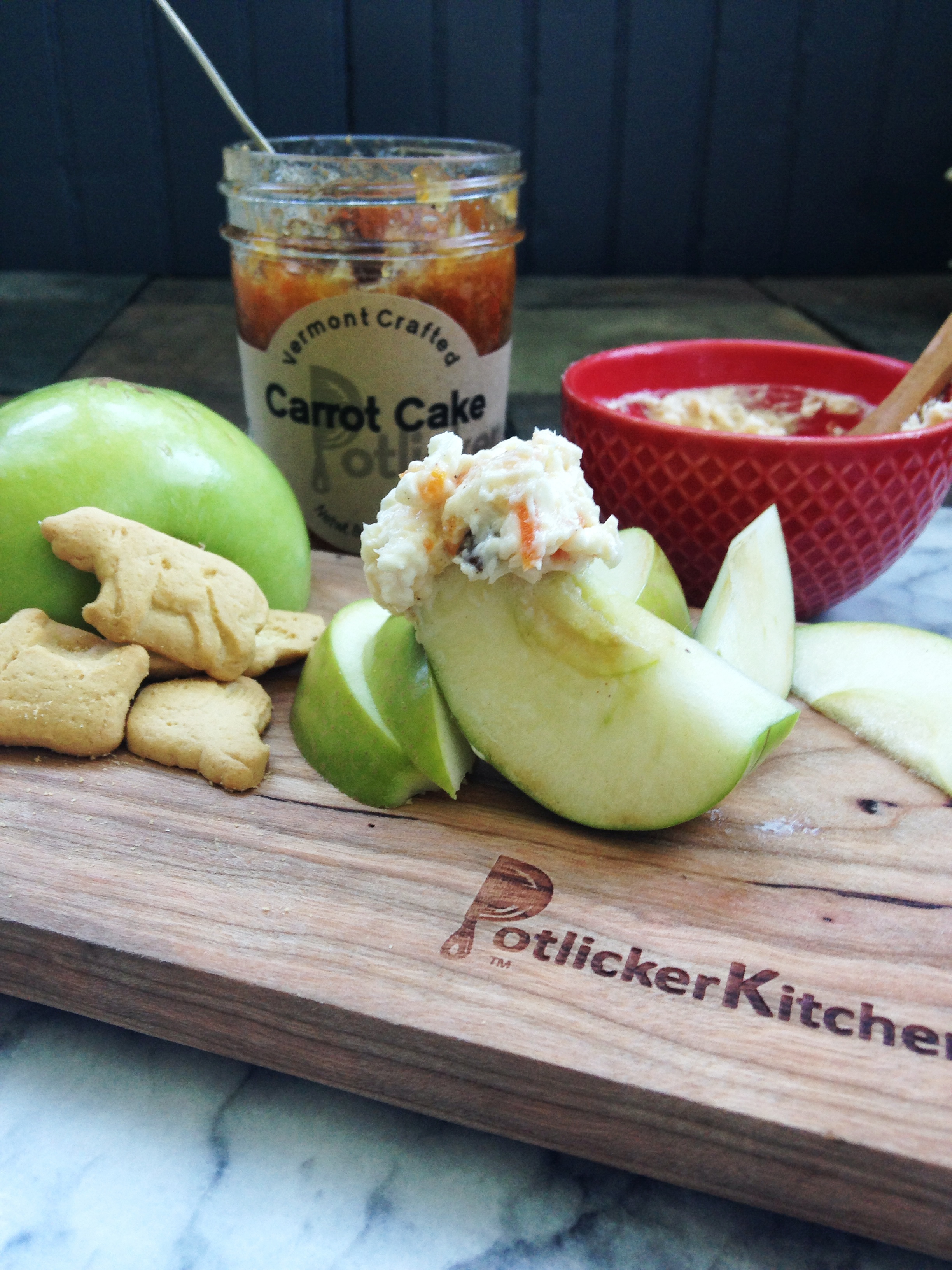 The Cabot store in Quechee has long been a friend of Potlicker and they carry a number of our jams including Carrot Cake Jam. One of the greatest things about shopping at the Cabot stores is that you get to sample all the goods! And how do you think they set out samples of jam? With Cabot Cream Cheese of course! They whip up cheese and jam to make a fabulous Carrot Cake dip that is perfect for snack time and parties.