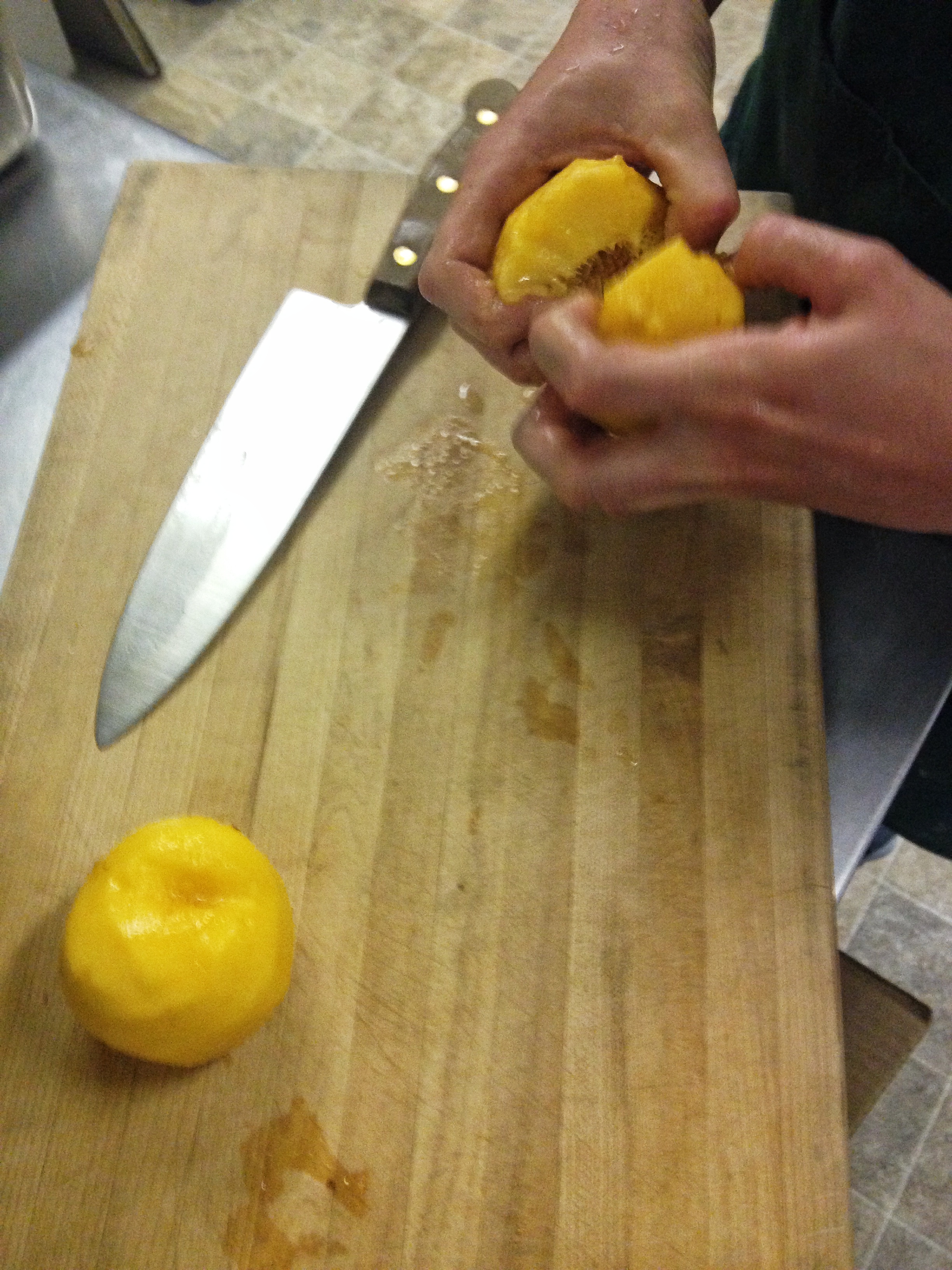 Begin any jam by preparing the fruit. These Washington peaches were so tender, I cut them with a wooden knife and peeled them by dragging the same knife over the surface. Then I made seams with the knife and halved the peaches with my fingers. I pulled out the peach pits and stored the peaches in a large zipper bag.