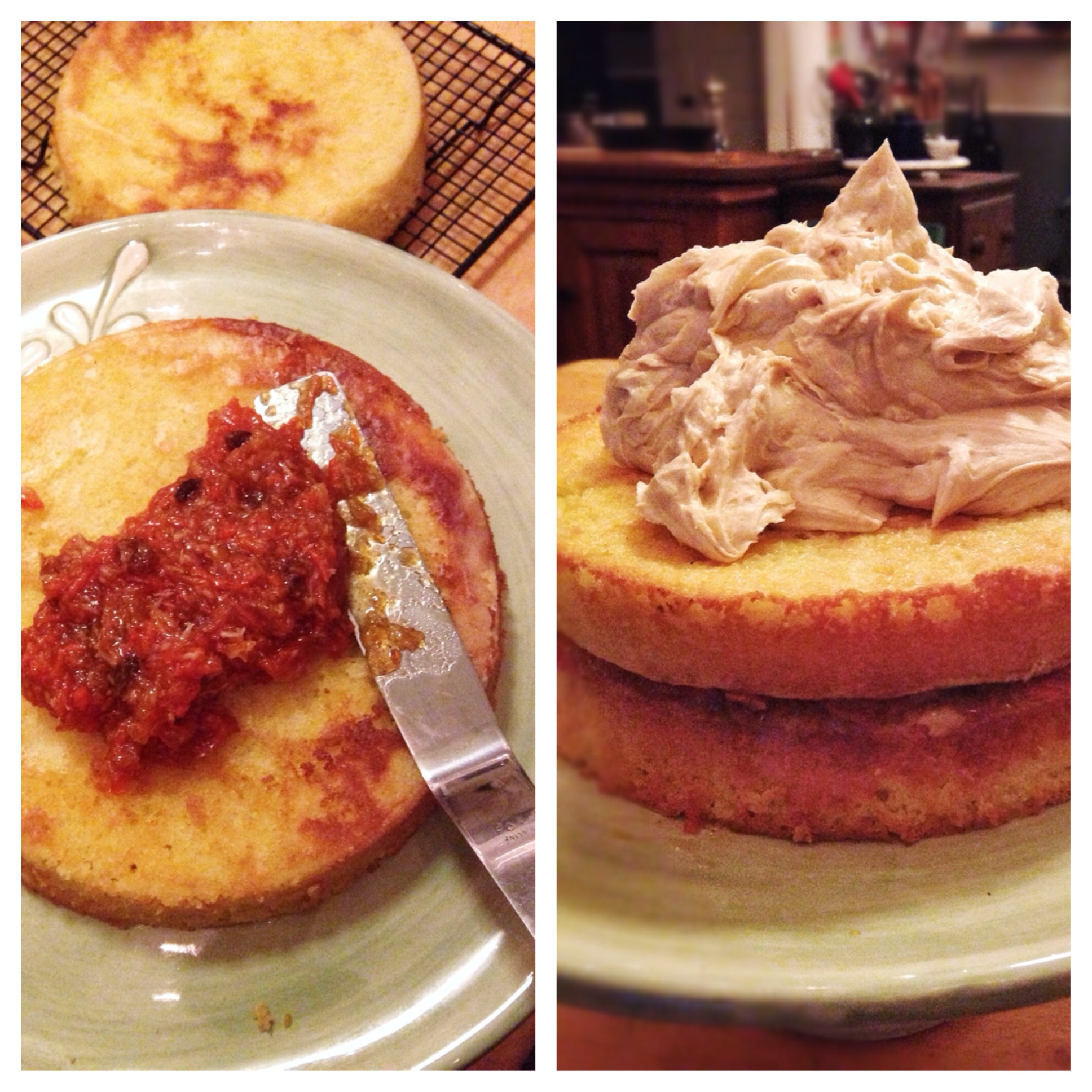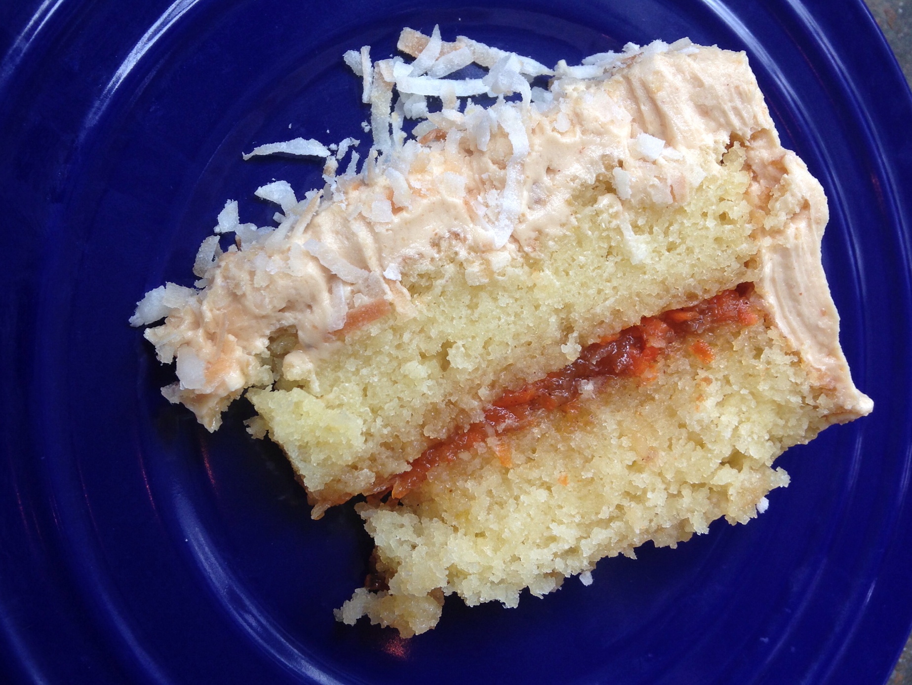 Vanilla butter cake filled with Carrot Cake Jam covered in peanut butter frosting and topped with toasted coconut.